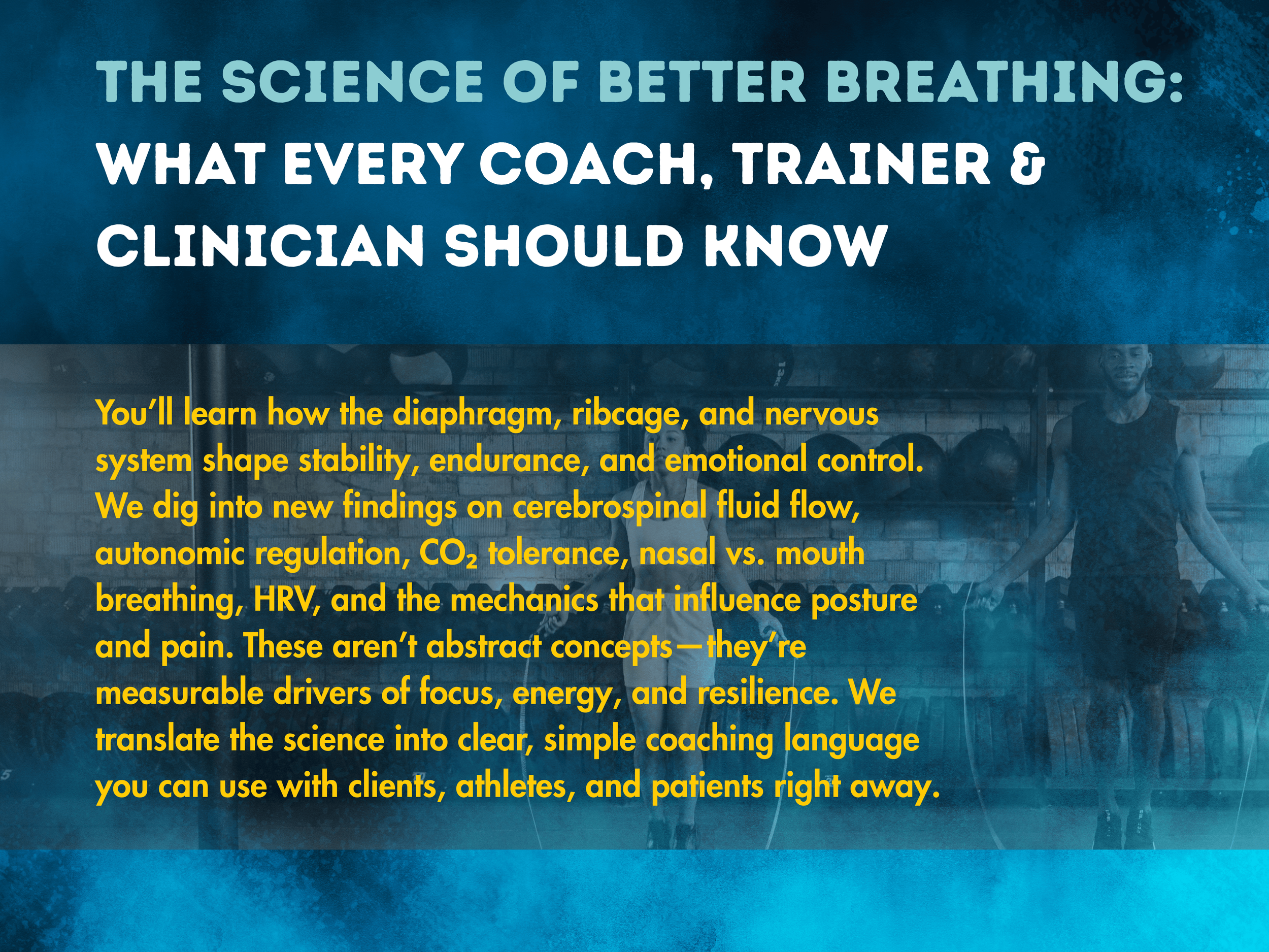 The Science of Better Breathing is designed for professionals who want more than theory—they want data they can trust and tools that work. This workshop pulls from the latest research on respiratory physiology, CO₂ tolerance, brain-breath mechanics, HRV, recovery, and performance. You’ll learn why outdated breathing habits hold people back and how small, precise adjustments can change everything from endurance and focus to pain, posture, and emotional steadiness. Trainers, PTs, medical staff, coaches, and educators will leave with a practical framework they can plug straight into sessions, practices, warm-ups, and rehab plans.
